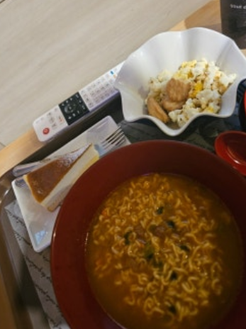 저희는 끓이는 라면으로 주문했어요. 라면이 나오고 나서는 디즈니플러스에서 어벤저스 애니메이션을 틀어두고 같이 봤습니다.