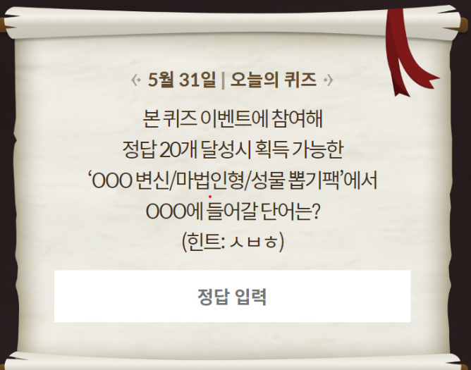 5월 31일에 있을 오늘 퀴즈는 OOO변신, 마술인형, 성물 뽑기 팩에 쓰이는 단어입니다.