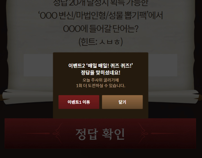 정답을 입력하면 누적 정답 수에 따라 보상이 지급됩니다.