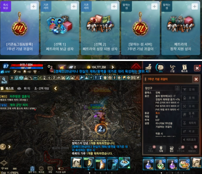 이번에는 기존 서버와 말하는 섬 서버 선택 1, 선택 2 보상과 7주념 기념 귀걸이 보상이 새롭게 걸려 있습니다.