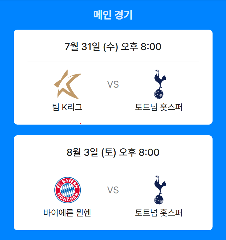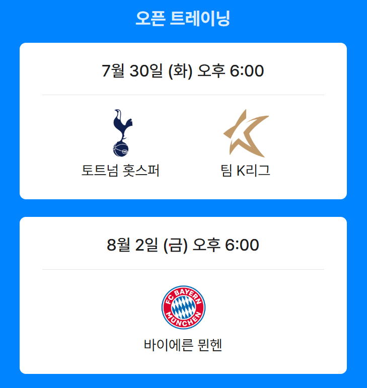 | 오픈 트레이닝 | K리그 vs 토트넘 | 오픈 트레이닝 | 뮌헨vs 토트넘 |